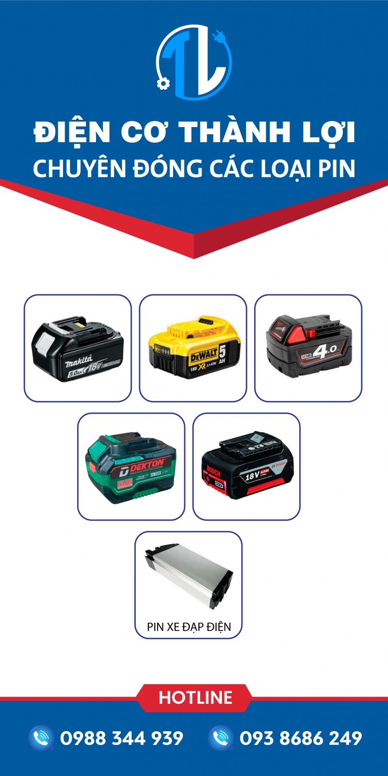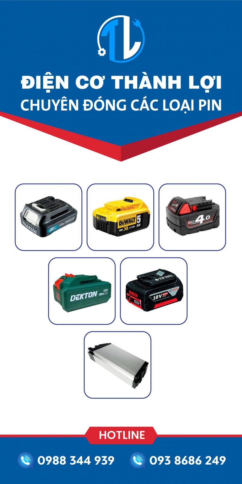 Điện Cơ Thành Lợi chuyên đóng cell pin chất lượng cao cho máy khoan, máy cắt và các thiết bị dùng pin. Đảm bảo an toàn, bền bỉ, giá tốt, bảo hành rõ ràng.