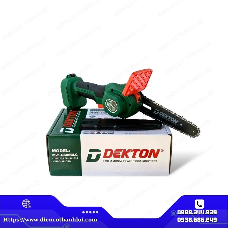 - Máy cưa xích Dekton M21-CS06BLC có phanh xích và cò điều chỉnh tốc độ mang lại hiệu suất tương đương máy cưa xích chạy động cơ, có thể điều chỉnh độ căng của xích. Máy còn giảm thiểu tốc độ quay chịu tải giữ cho hiệu quả hoạt động, tiếng ồn không tải được giảm.